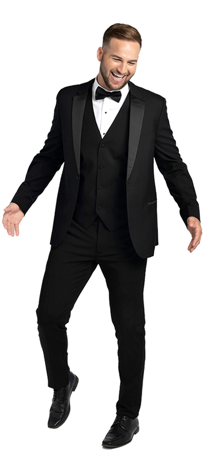 Flow Formal Wear's one button tuxedo is among the most versatile and comfortable black tuxedoes. It's classic design never goes out of style, and you will always feel great in the jacket. The Black One Button Tuxedo comes with matching pants and vest. Choose a traditional bow or modern long tie.